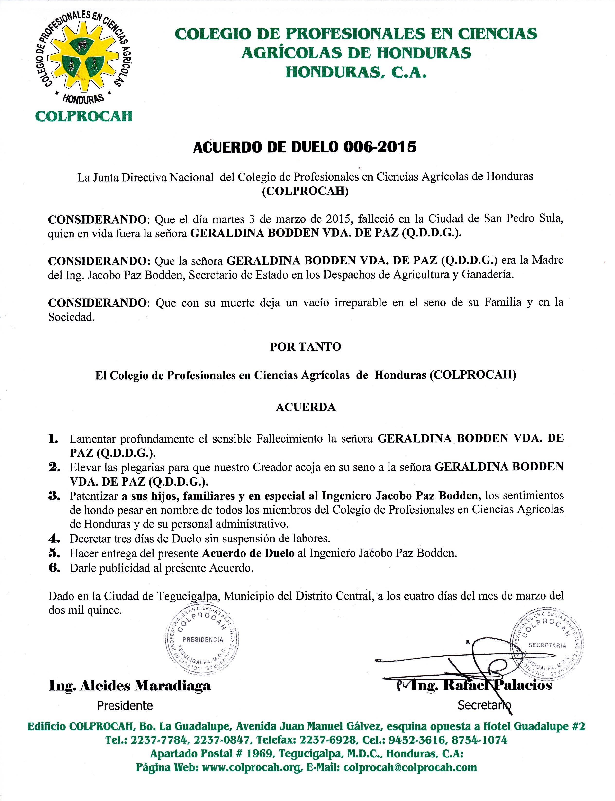 006-2015 Acuerdo de Duelo SRA. GERALDINA BODDEN VDA. DE PAZ