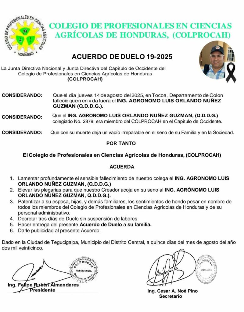 Acuerdo de Duelo No. 19-2025 **Ing. Agrónomo Luis Orlando Núñez Guzmán, (Q.D.D.G.), Col. 2879**🙏