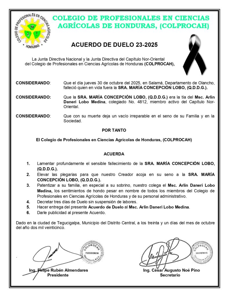 Acuerdo de Duelo No. 23-2025 **Sra. María Concepción Lobo, (Q.D.D.G.)** Tía de nuestro colega del Capítulo Nor-Oriental, Msc. Arlin Daneri Lobo Medina. 🙏🏽🕊