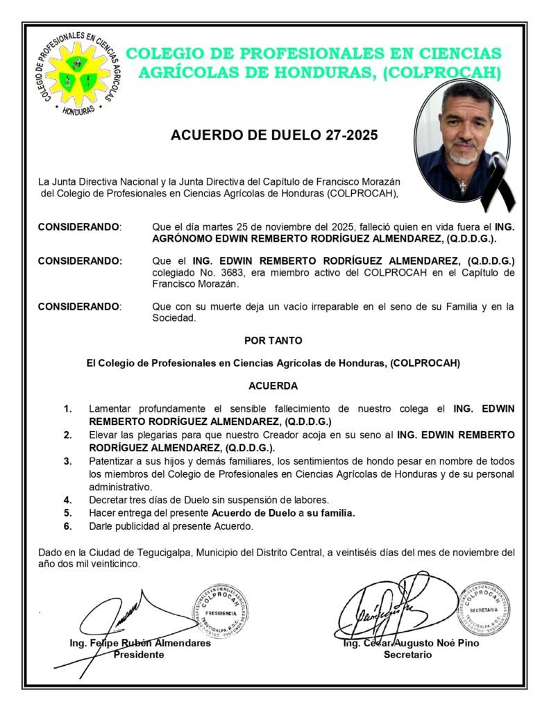 Acuerdo de Duelo No. 27-2025 **ING. EDWIN REMBERTO RODRÍGUEZ ALMENDAREZ, (Q.D.D.G.), Col. No. 3683 🙏🏽