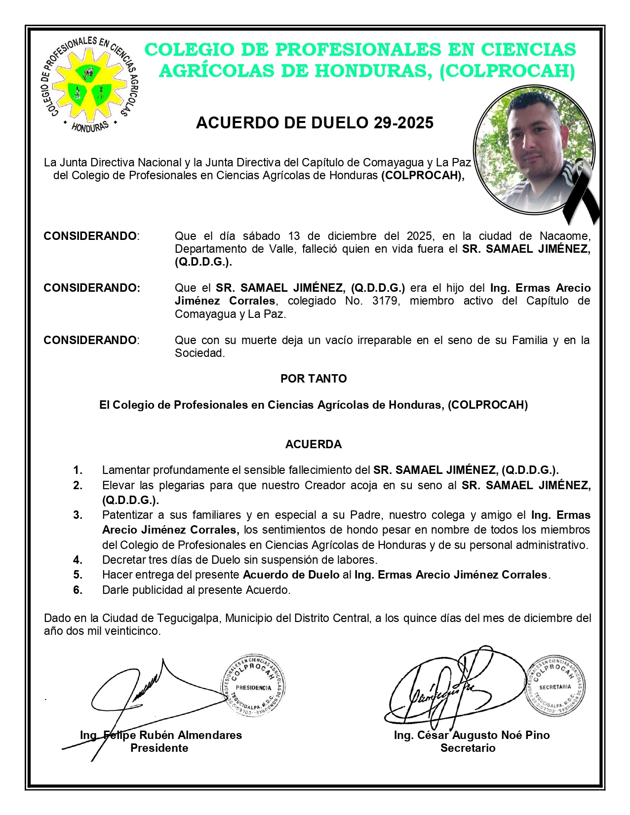Acuerdo de Duelo No. 29-2025 **SR. SAMAEL JIMÉNEZ, (Q.D.D.G.)** Hijo del Ing. Ermas Arecio Jiménez Corrales. 🙏🏽🕊