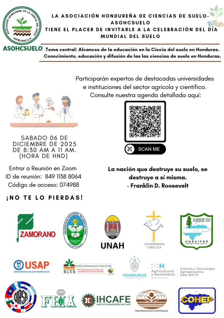 La Asociación Hondureña de la Ciencia del Suelo (ASOHCSUELO) tiene el agrado de invitarle a la celebración del Día Mundial del Suelo 2025