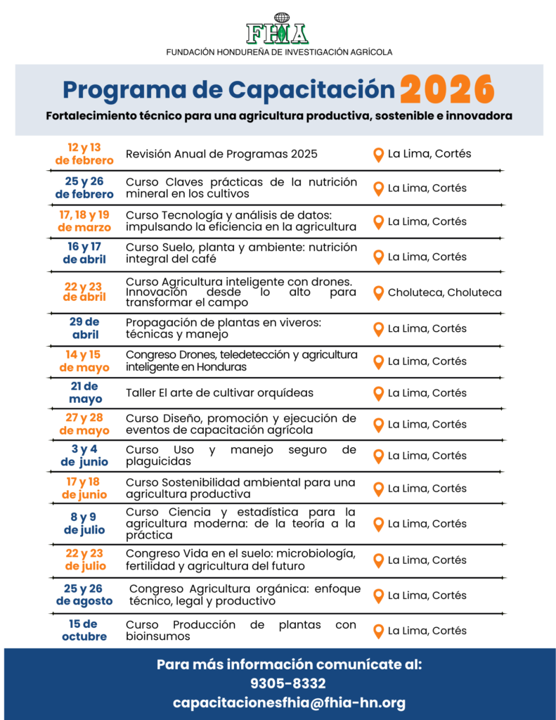 La FHIA se complace en compartir con usted el Programa de Capacitación 2026, diseñado para fortalecer conocimientos, habilidades técnicas y toma de decisiones en el sector agrícola.